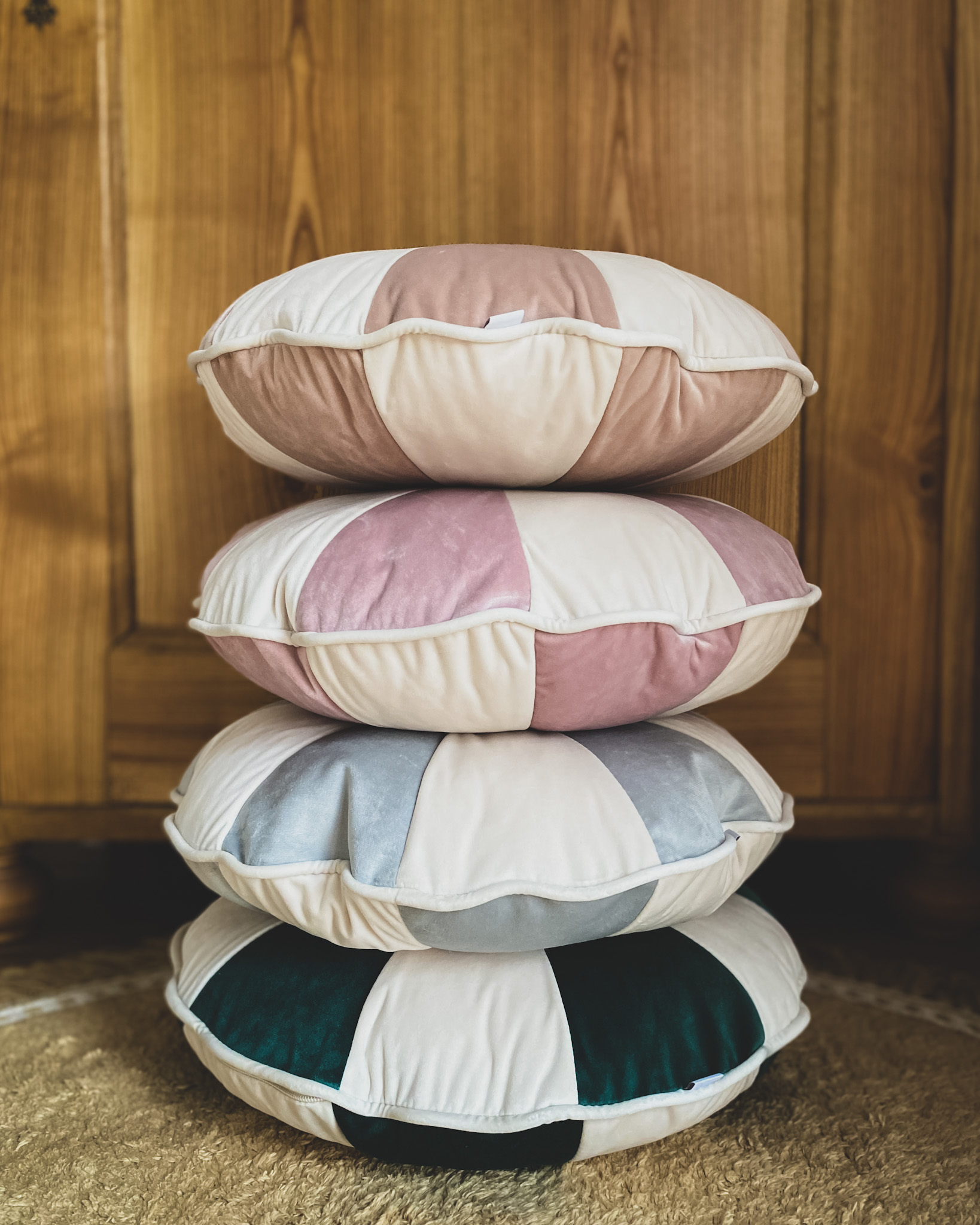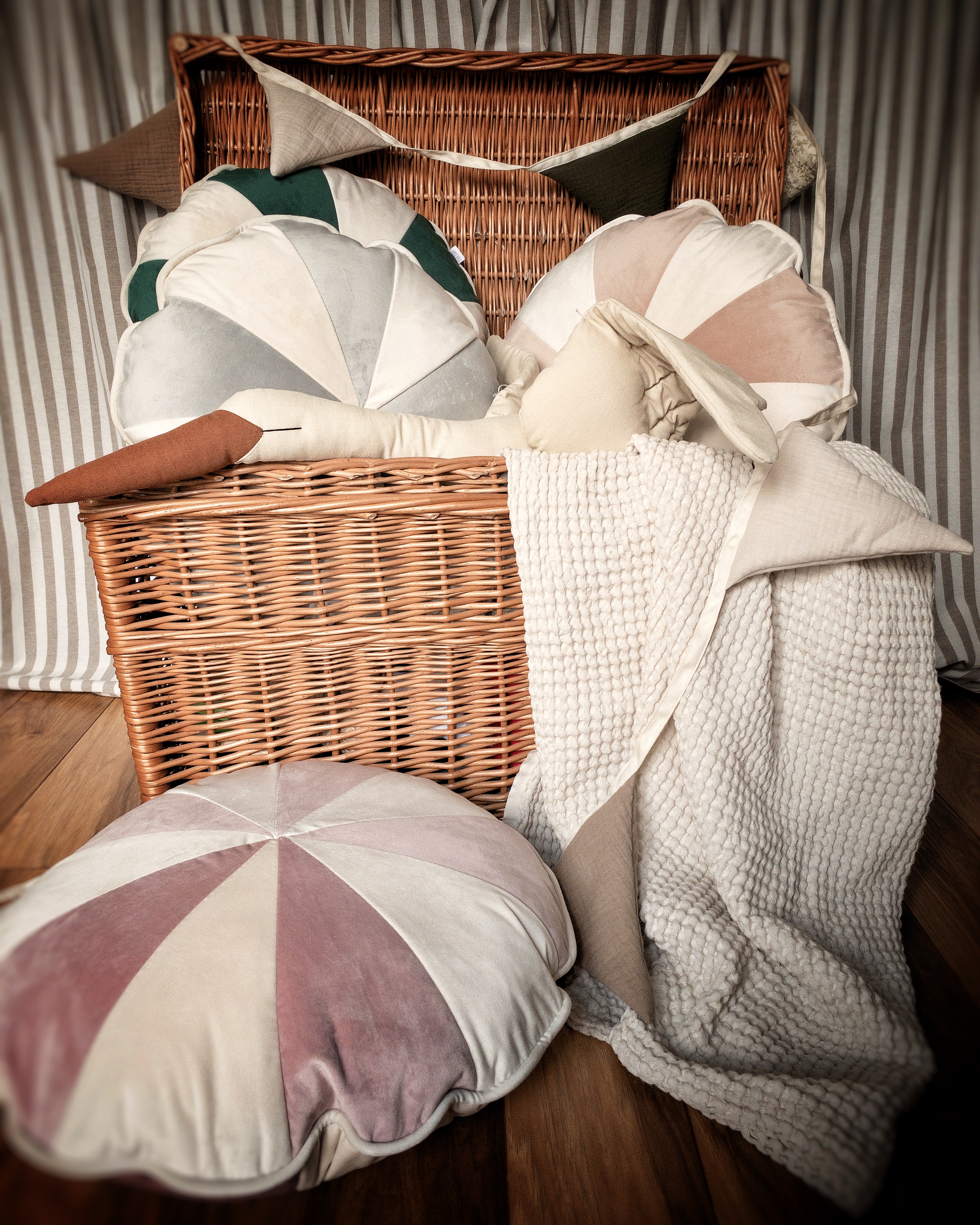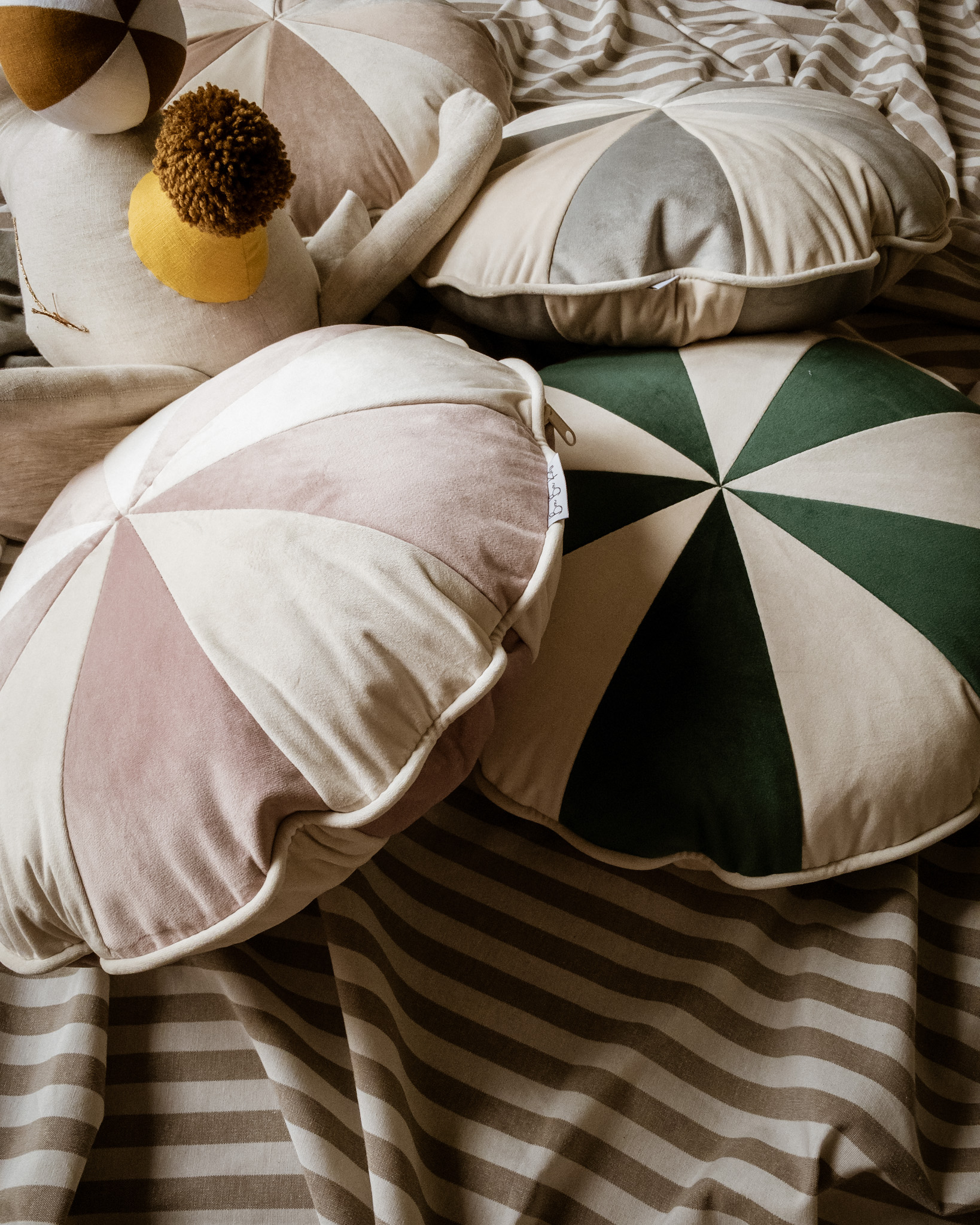 Questo delizioso cuscino, ispirato alle girandole e le giostre, con il suo design a spicchi e la sua forma rotonda unisce il colore con l’armonia delle sue forme. È un complemento d'arredo elegante e ideale per la cameretta dei bambini, la camera da letto o il soggiorno, da posizionare su un letto, una poltrona o un'area giochi.