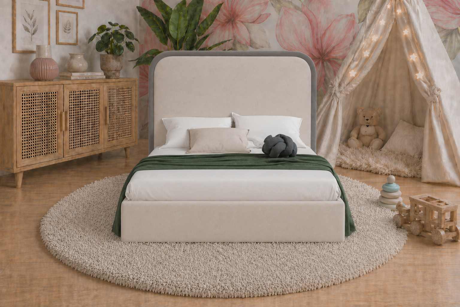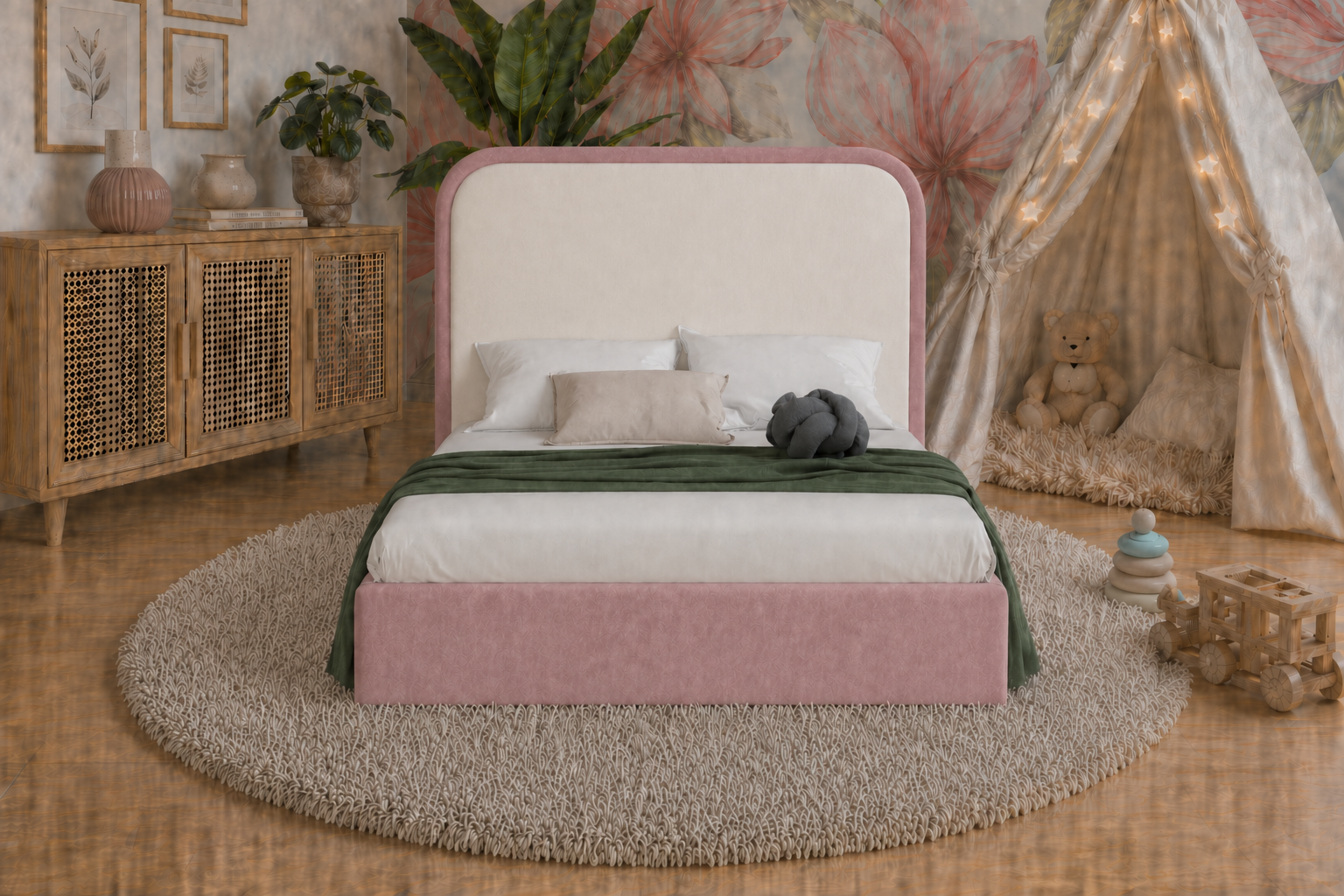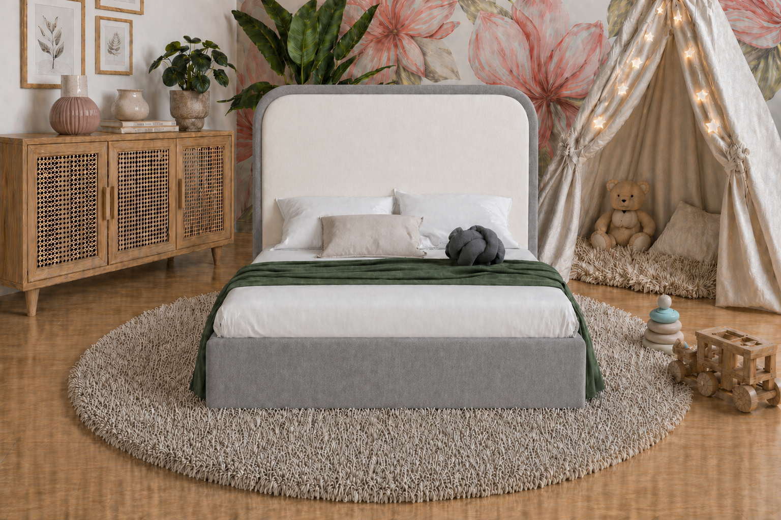 Il nostro Essential Bed, un modello che esalta l’essenzialità delle forme e dell’essenza di Bon Bon Kids. Testata leggermente addolcita sui lati e doppio colore nella sua imbottitura. Colori e dimensioni personalizzabili.