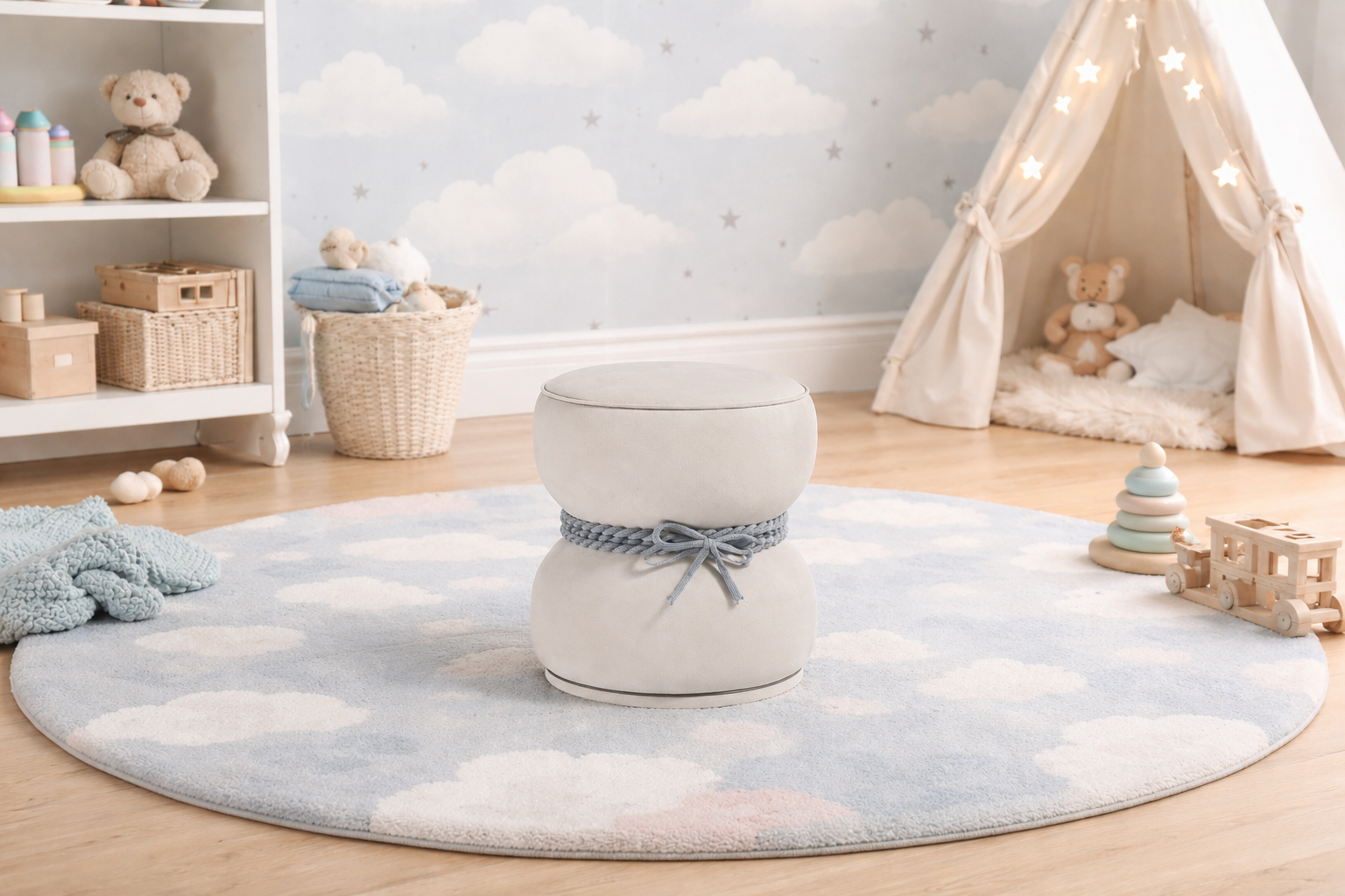 Pouf Fiocco, un piccolo e simpatico pouf reso unico dal suo fiocco laterale. Il Pouf Fiocco può essere utilizzato sia come pratico comodino sia come seduta.