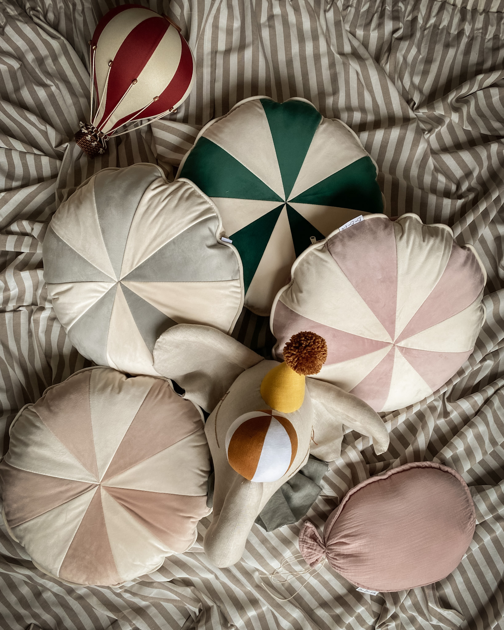 Questo delizioso cuscino, ispirato alle girandole e le giostre, con il suo design a spicchi e la sua forma rotonda unisce il colore con l’armonia delle sue forme. È un complemento d'arredo elegante e ideale per la cameretta dei bambini, la camera da letto o il soggiorno, da posizionare su un letto, una poltrona o un'area giochi.