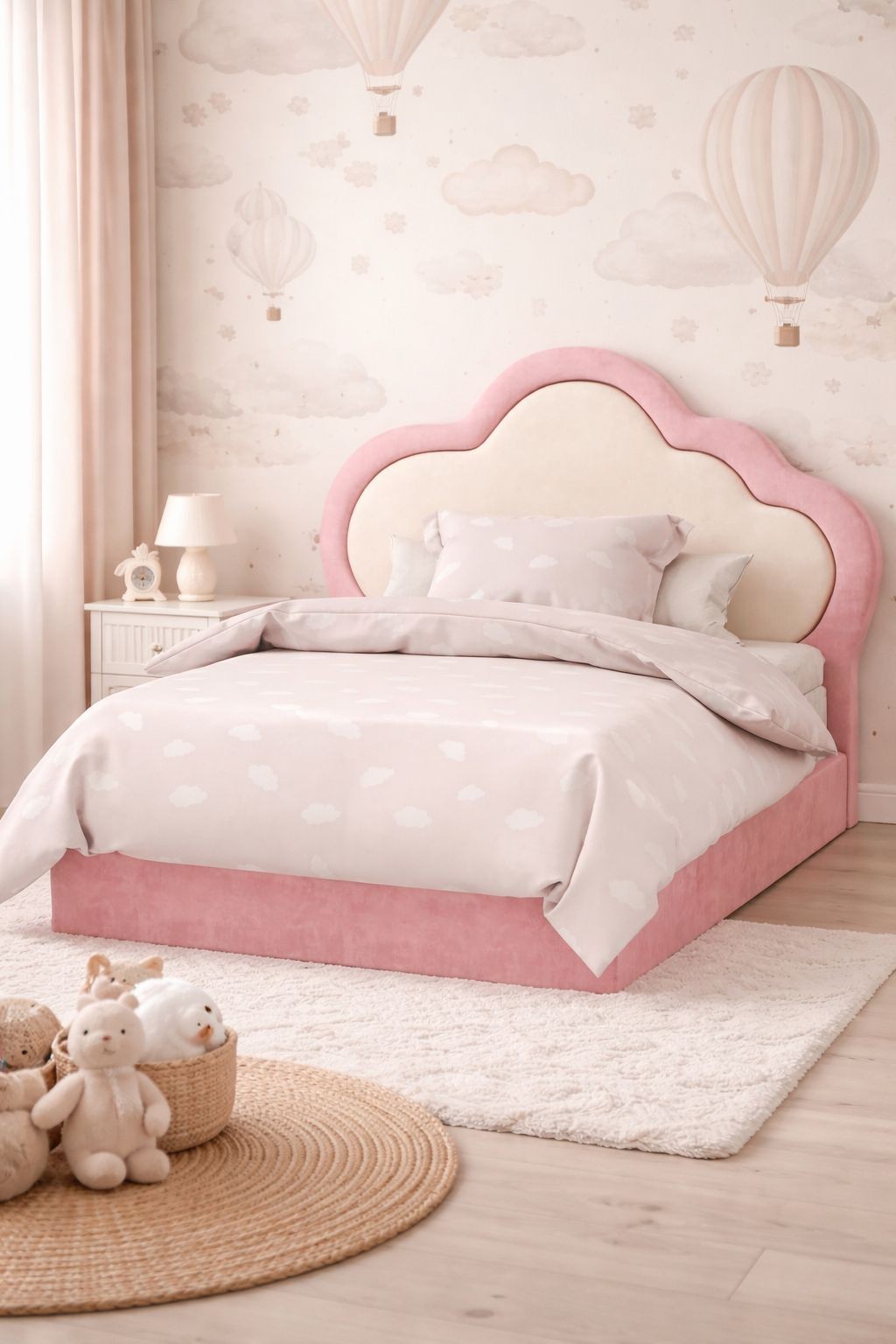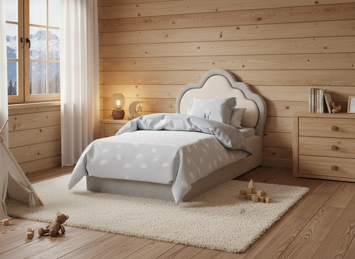 La forma del nostro letto senza tempo Aura è pensata per essere originale e ricordare spazi dolci e armoniosi come la coccola di una casa di montagna.